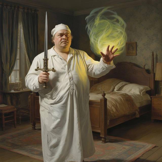 Дверь была приоткрыта, и я увидел, как Валерон носится по комнате, а за ним вполне бодро рассекает вроде бы не так давно спокойно спавший главнюк. Смотрелся последний комично в длинной ночной рубашке и с колпаком на голове, но Валерону точно было не до смеха. Он постоянно отплевывался, но плевки, если попадали в цель, никак не вредили противнику, зато вредили обстановке. Не загорелось ничего только чудом. Или это было результатом специальной обработки? Или артефактов?