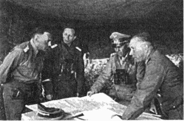 Слева направо: полковник Фриц Байерляйн, начальник штаба (фамилия автору неизвестна), генерал-полковник Эрвин Роммель и генерал-лейтенант Вальтер Неринг.