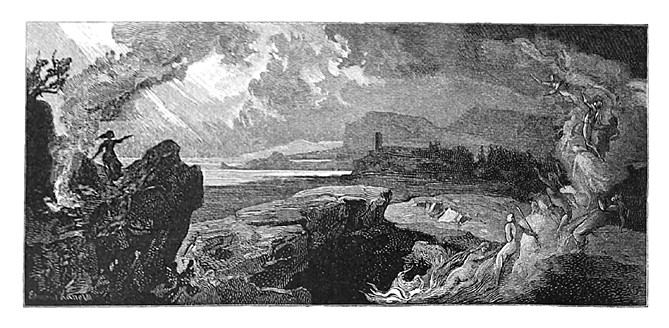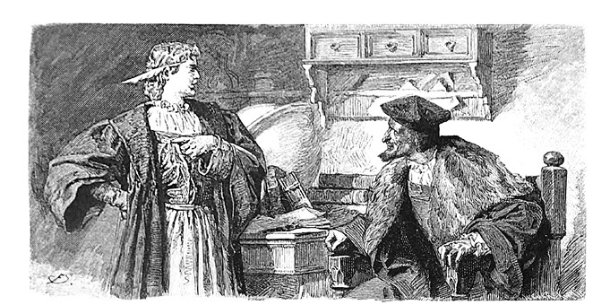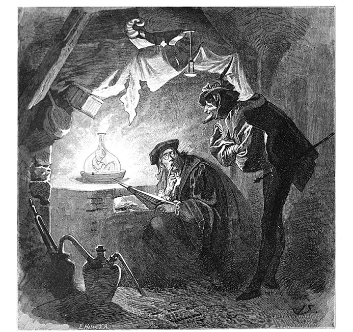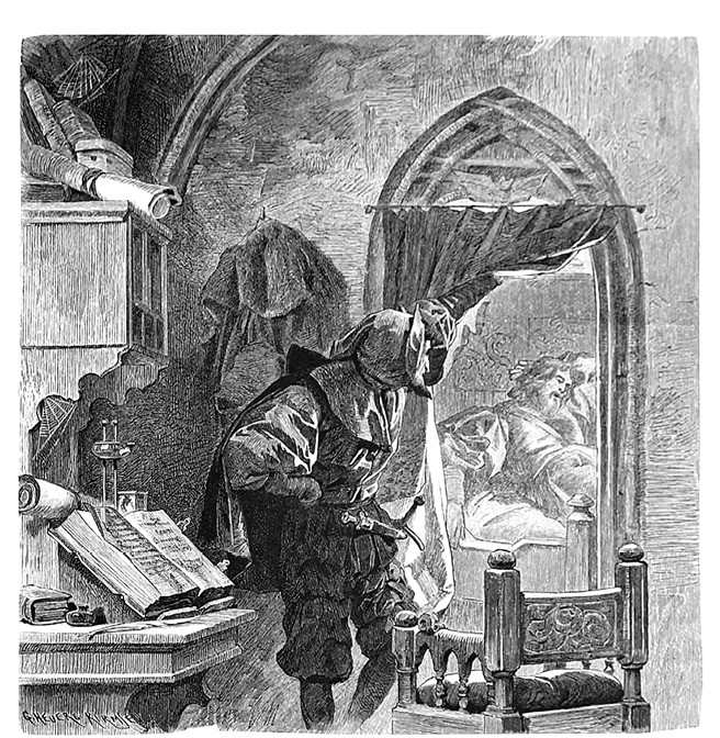 Мефистофель выходит из-за занавески. Когда он ее приподнимает и оглядывается назад, там виден Фауст, распростертый на старинной прадедовской кровати.