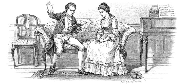 Лотта хотела было усадить девушку с работой в соседней комнате, но передумала. Вертер прохаживался по комнате, она села к фортепьяно, заиграла менуэт, но пальцы не слушались ее. Взяв себя в руки, она непринужденно села к Вертеру, который тем временем уже занял свое излюбленное место на канапе.