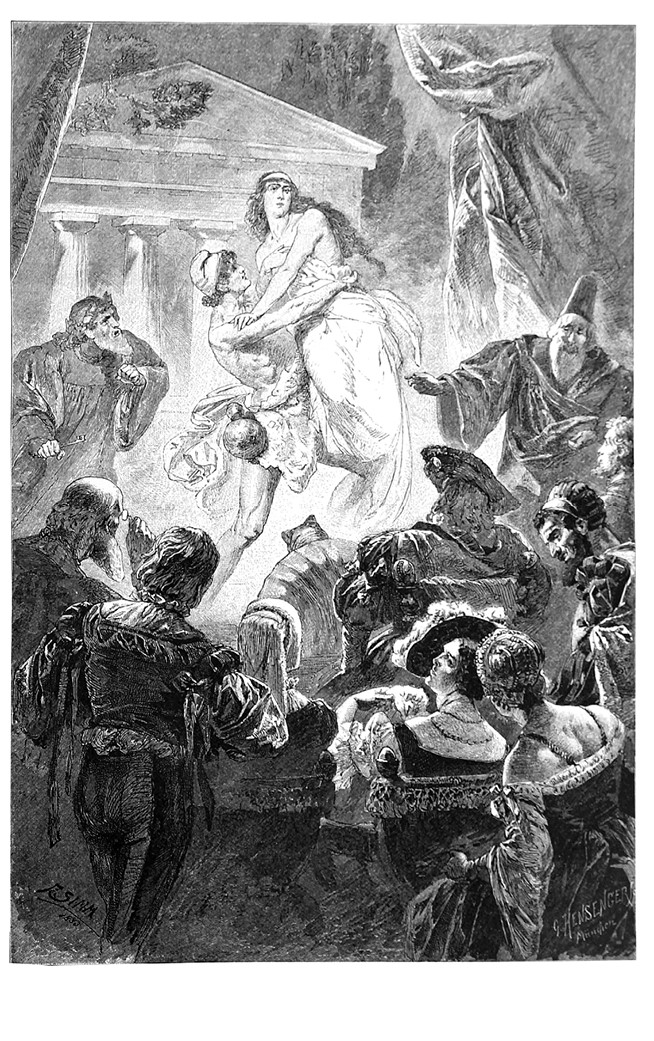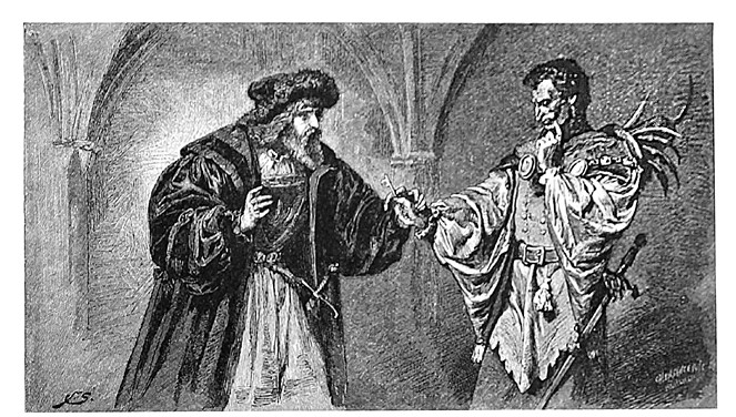 Солнечное утро. Император, окруженный придворными и фрейлинами. Фауст и Мефистофель, одетые пристойно, без излишеств, преклоняют пред ним колена.