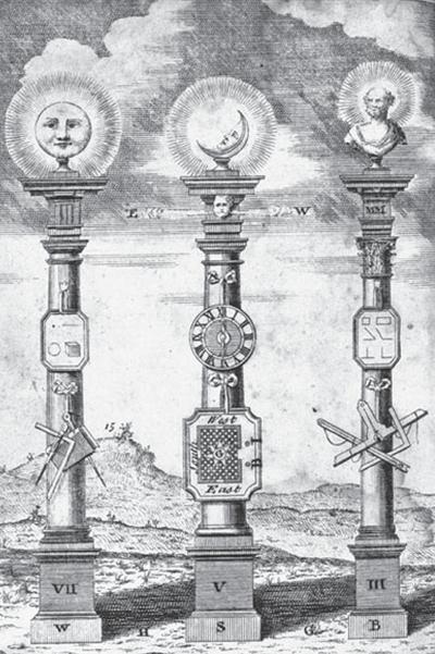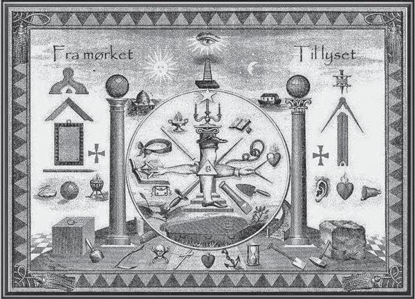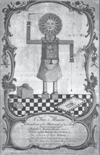 В гравюрах, рисунках, акварелях, сопровождающих масонские трактаты, встречается изображение фигуры аллегорического франкмасона, составленной из инструментов-эмблем средневекового каменщика. Голова фигуры изображается в виде солнца, на шее – кронциркуль, руки составлены из угольников, символизирующих прочность нравственных основ учения. Ноги фигуры представляют собой два столба Иерусалимского храма – Воаз и Яхин. В руках – циркуль (символ расчета, осмотрительности) и отвес (символ ясности, определенности). Фартук из овчины (привычный атрибут каменщика) – символ чистоты. Мозаичный пол в черную и белую клетку, на котором стоит фигура, означает добро и зло в мире. На полу лежит полуразвернутый свиток с чертежом теоремы Пифагора. [29]29