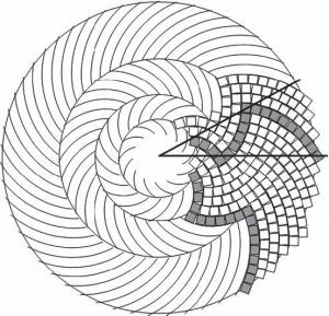 Как видим, части в нем располагаются согласно вышеупомянутой последовательности. К тому же, если провести линии через углы этих квадратов в порядке возрастания, то мы получим не что иное, как уже известную спираль Архимеда.
