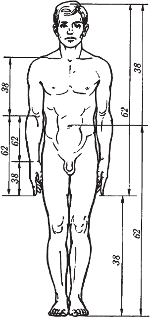Рост человека делится в золотых пропорциях линией пояса, а также линией, проведенной через кончики средних пальцев опущенных рук, нижняя часть лица – ртом, и т.д.