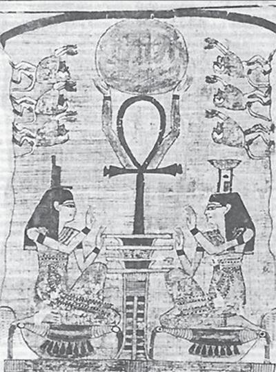 Анкх, поддерживающий восходящее солнце, Исида и Нефтис. Фрагмент папируса Ани