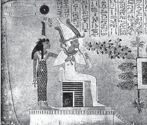 Осирис в виде царя. Рисунок из гробницы Натх. Осирис на троне. Его спутница, Изида, держит в руках египетский крест