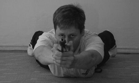 Фото 36. Положение стрелка на спине, ноги врозь, руки с оружием вынесены вперед