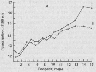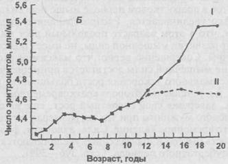 Рис. 20.5.Изменение содержания гемоглобина (А) и числа циркулирующих в крови эритроцитов (Б) у детей, иллюстрирующее появление половых различий в подростковом периоде (Tanner, 1962). I – мальчики, II – девочки. Смешанные продольные данные из Mugrage and Anderson (1936, 1938), Amer. J. Dis. Child.