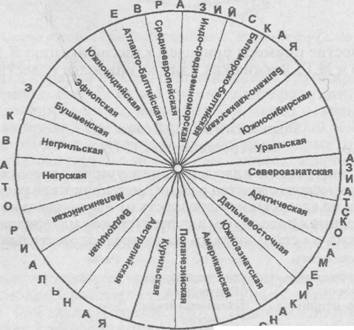 На схеме видно, что промежуточное место между экваториальной и евразийской большими расами занимают две расы: эфиопская и южноиндийская; между евразийской и азиатско-американской размещаются также две расы – южносибирская и уральская; наконец, особое место по значительной части признаков промежуточное между американской и австралийской занимают полинезийская и курильская расы (рис. 183).