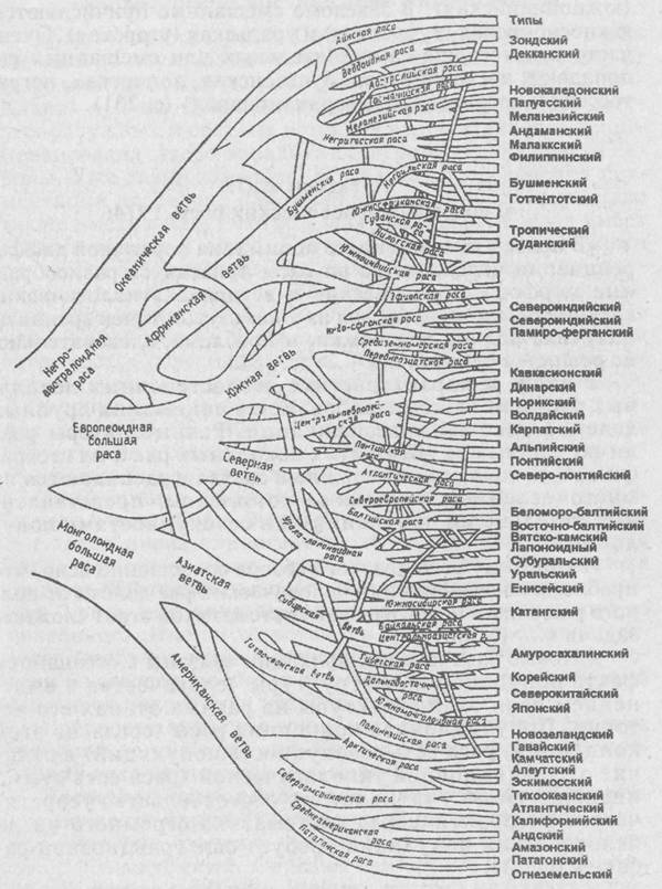 Рис. 99. Схема классификации человеческих рас по Г. Ф. Дебецу (1958). Переплетение и слияние ветвей отражают процессы смешения, имевшие место в различные периоды эволюции современного вида