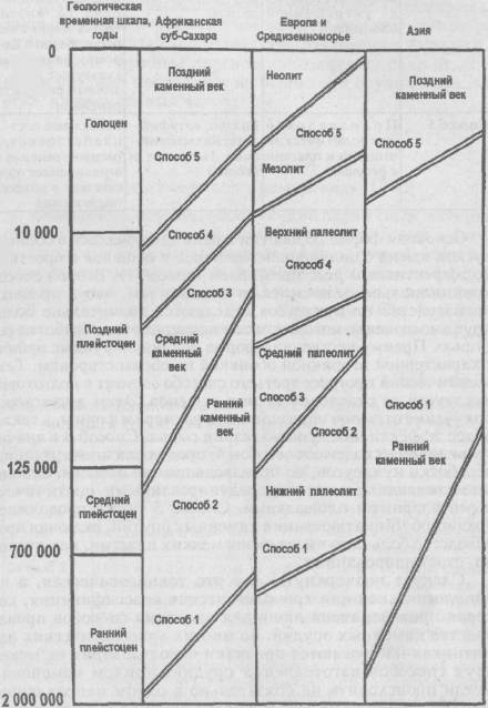 Рис. 2.16. Классификация ранних фаз первобытной истории, в связи с геологической и временной шкалой и технологическими приемами (см. табл. 2.2.) (Isaac, 1972, р. 384, с изменениями)» (с. 59–63).