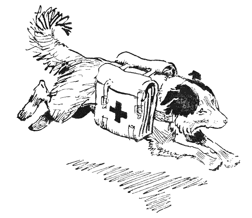 И Малыш помчался вперёд по дороге, чуть прижимая уши при свисте пуль. Он долго бегал по лесу, ловя чутким носом нужный ему запах. Внезапно ноздри его расширились, и он кинулся вперёд по следу. В густом ельнике он нашёл одного из тех, кого искал. Связист был мёртв. Снег вокруг был окровавлен. Малыш подобрался к связисту и, повинуясь своему собачьему инстинкту, тихонько завыл. Потом, вспомнив, чему его учили, он отошёл от мёртвого и продолжал поиски. В маленьком овражке он обнаружил скоро и второго связиста. Тяжело раненный, он лежал в полузабытьи, раскинув в стороны руки. Малыш потянул его зубами за рукав, тихонько повизгивая, начал лизать лицо, руки. Раненый приоткрыл глаза, медленно приходя в сознание. Он схватился рукой за ошейник собаки, и Малыш, виляя хвостом, повернулся к нему боком, где в кармашке санитарного вьюка были надёжно укреплены фляги с водкой и водой.