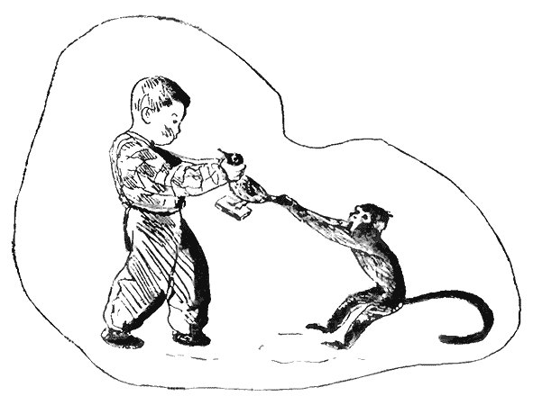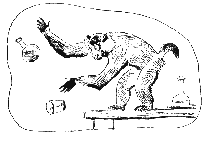 Работники института побежали в питомник. Через некоторое время заведующий питомником заглянул в окно. Он увидел Яшку, который сидел на столе, обнимая руками большой стеклянный шар. Шар был наполнен водой, и Яшке трудно было поднять его и стукнуть об пол. Он тужился изо всех сил.