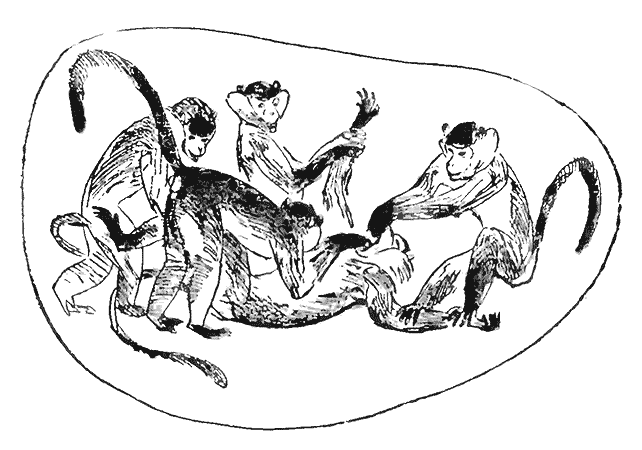 Подбежав к клетке, она увидела необычную картину. Броненосец лежал на земле, а вокруг, держа его руками, сгрудились остальные обезьяны. Они открыли пасть Броненосца и вытаскивали из мешочков лакомства. Уничтожив все его запасы, они отскочили от Броненосца. И он, ограбленный, обиженно пища, уселся в уголке.