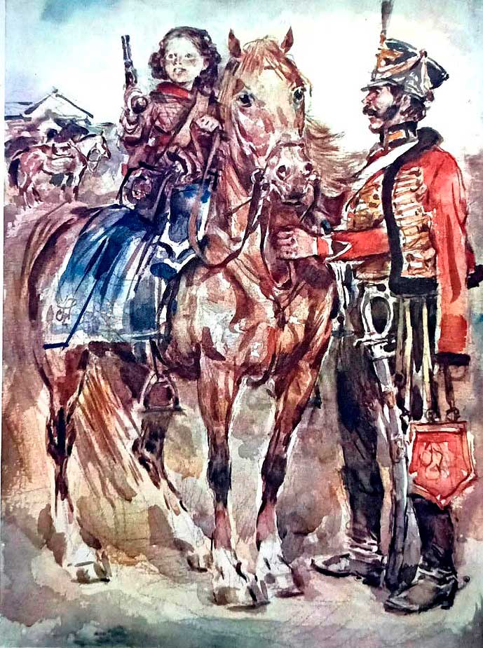– Но всё равно тебе не сносить головы! – ворчал старый улан, учивший её солдатской науке. – Ты делаешь глупость за глупостью. В самом пылу сражения отдал лошадь. Да пеший кавалерист среди битвы – пропащий человек. В другой раз весь полк ожидал приказа, а ты лёг спать и опять чуть не проспал. Теперь тебя отпустили подковать лошадь, а ты что сделал? Ты опять устроился вздремнуть! Да пойми ты, что солдат должен быть более, чем человек. Нельзя спать – и солдат не спит. Солдату не положено отставать от своих, а то пропадёшь. Надо быть всегда на коне и всегда на своём месте в строю…