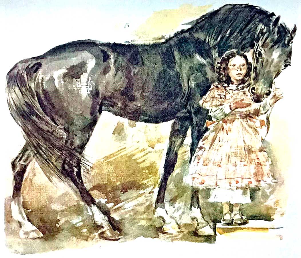 – Алкид! Умница! Хлеба хочешь? И сахару я для тебя припрятала. Сейчас у конюха овса попрошу. – Надежда подолгу говорит Алкиду ласковые слова и, встав на цыпочки, гладит строптивого коня.