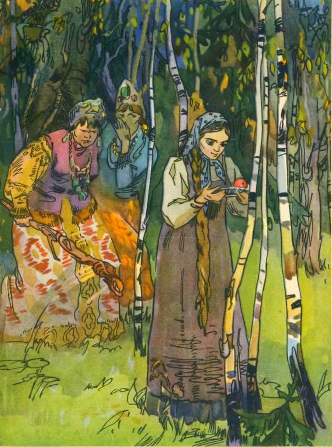 Вдруг раздался звон серебряный, покатилось яблочко по блюдечку, наливное по серебряному, а на блюдечке все лесные места видны. Где земляника растёт, где цвет лазоревый цветёт, где грибы прячутся, где ключи бьют, где на заводях лебеди поют.
