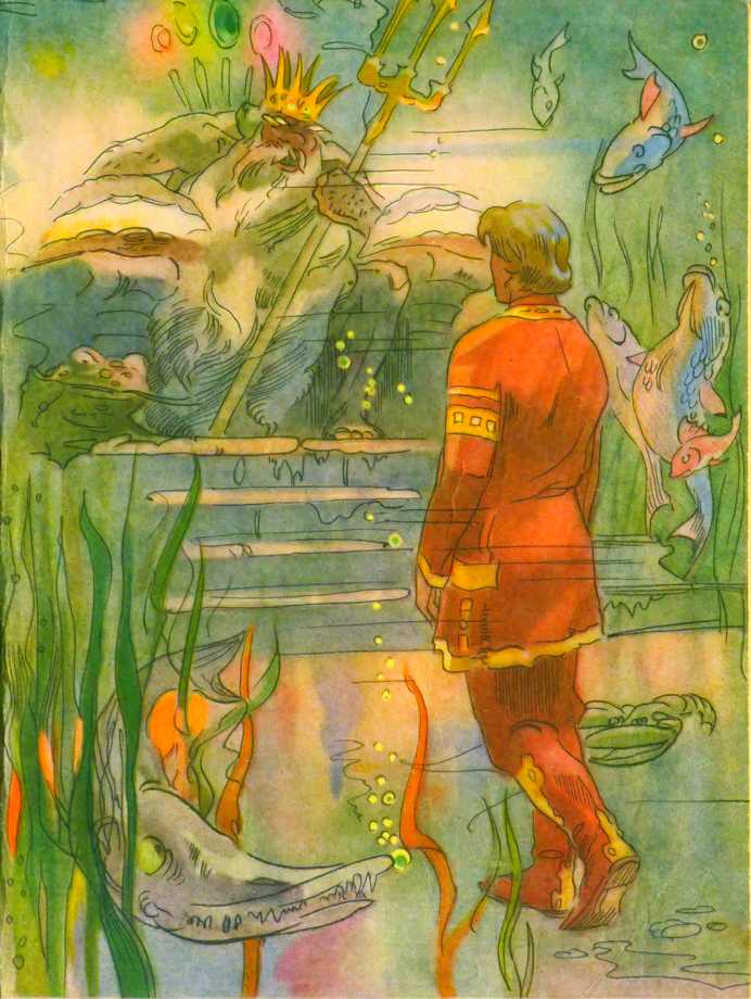 Сидит царь на троне в золотой короне. Кругом жабы пялятся, ерши ершатся, щуки грозятся. Рак клешнёй Ивана-царевича за плечо схватил. Сом большим усом ноги обвил.