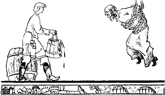 Схватил старичок железный толкач, бил Горыню, бил, под лавку забил; съел всё до крошки и прочь пошёл.
