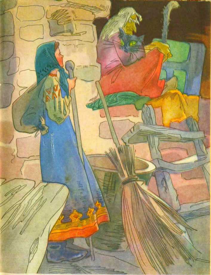 Повернулась к ней избушка передом; вошла в неё девица, а там Баба-яга лежит на печи, на девятом кирпиче.