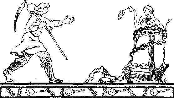 Подошёл Ванюшка к царевне, ухватил золотую цепь богатырской рукой, разорвал, как гнилую верёвочку. Потом лёг на песок, положил голову Марье-красе на колени и говорит: