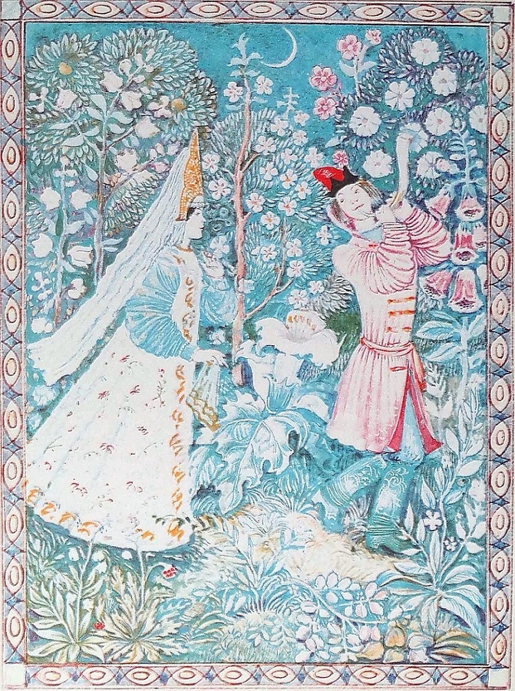 Заиграл тут Симеон-младшенький в берестяной рожок. Вышла Елена Прекрасная на золотой порог. Симеон играет, сам по саду идёт, а Елена Прекрасная за ним вослед. Симеон через сад и она через сад. Симеон через луг – и она через луг. Симеон на песок – и она на песок. Симеон на корабль – и она на корабль.