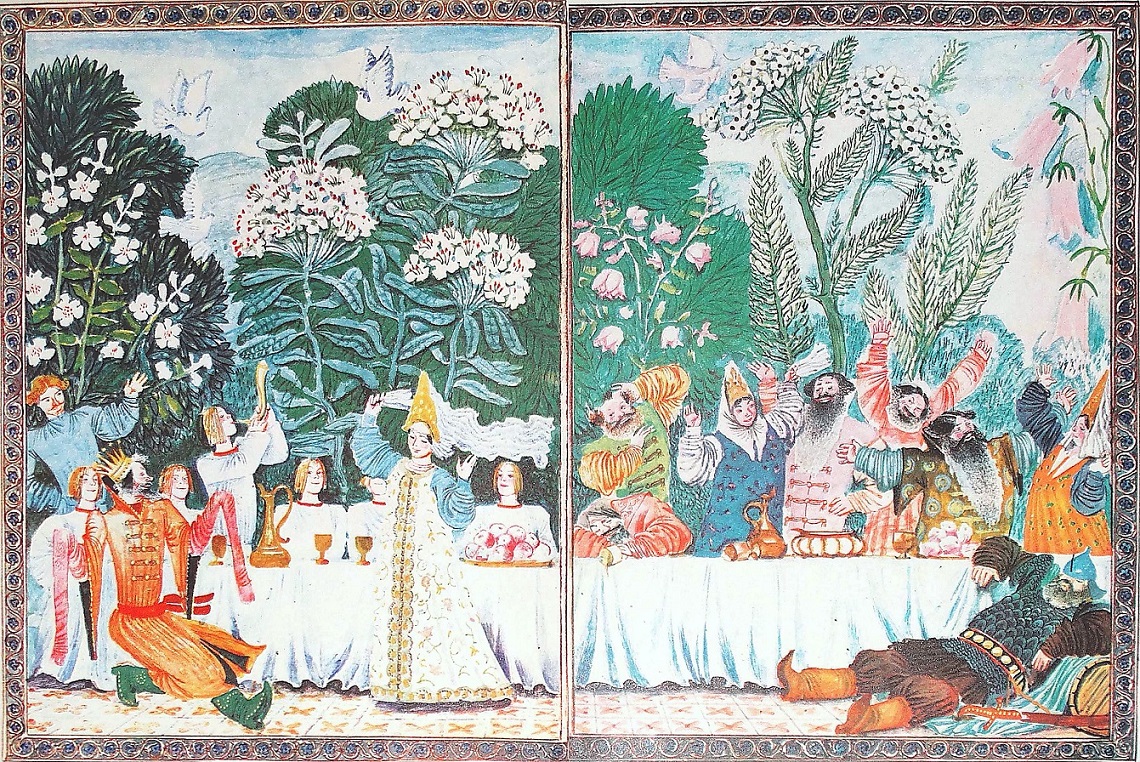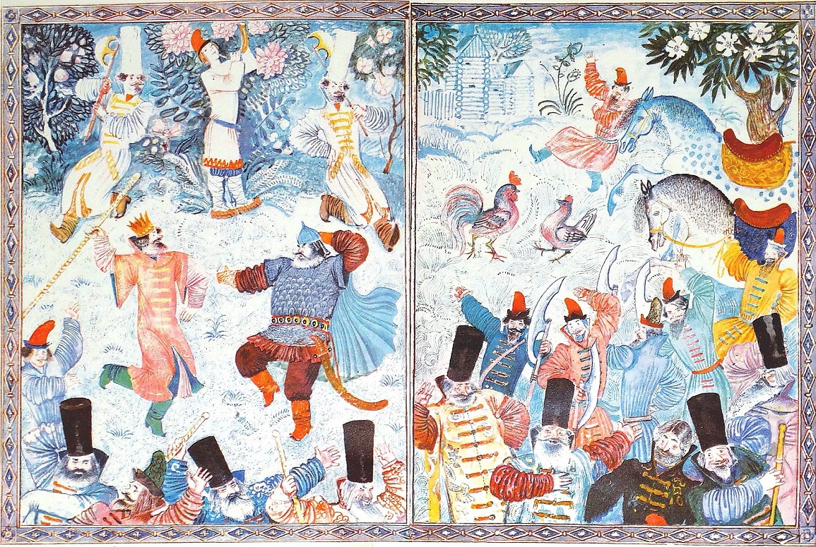 И царь пляшет, и царевна пляшет, и бояре пляшут, и боярышни. В стойлах лошади в пляс пошли. В хлевах коровушки притопывают. Петухи, куры приплясывают.