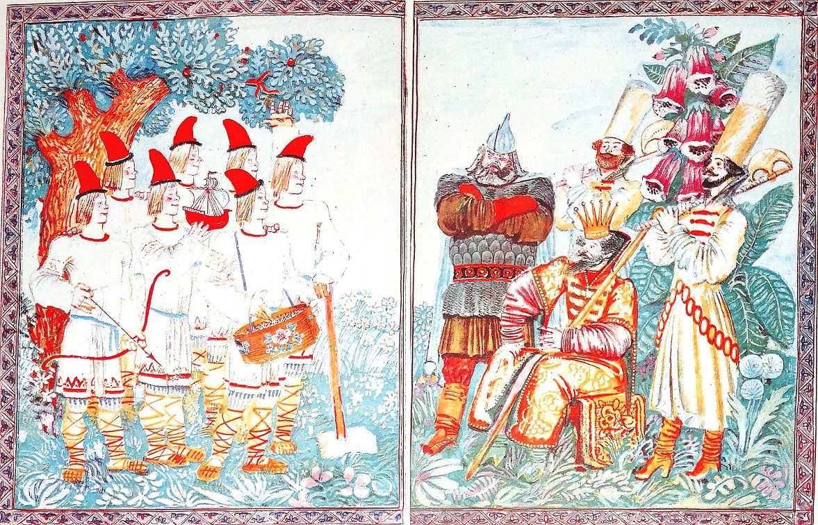Взял тут Симеон-младшенький берестяной рожок, заиграл на нём плясовую русскую. Как пошёл тут народ плясать, резвы ножки переставлять! И царь пляшет, и бояре пляшут, и стражники пляшут. В стойлах лошади в пляс пошли. В хлевах коровушки притопывают. Петухи, куры приплясывают.