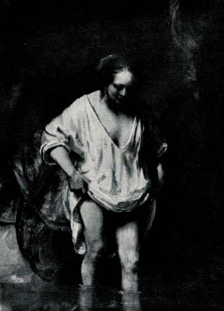 Второй жемчужиной собрания Холуэлла явилась «Купающаяся в ручье женщина» Рембрандта, может быть, лучшее произведение этого мастера из всех его многочисленных работ, находящихся в галерее. Это уже поздняя вещь Рембрандта, своей удивительной простотой и непритязательностью резко отличающаяся от таинственной романтичности «Христа и грешницы». Перед нами не библейский сюжет, не Вирсавия и не Сусанна, а самая обыкновенная молодая женщина, собирающаяся выкупаться в лесном ручье и, приподняв рубашку, пробующая, какова вода. В ее чертах мы узнаем Гендрике Стоффельс, преданную подругу последних лет художника. Этот интимный бытовой сюжет, не притязающий ни на какое философское или психологическое значение, а лишь фиксирующий какой-то краткий момент, выхваченный из жизни, Рембрандт наполняет глубокой поэтичностью и волнующим чувством красоты окружающей действительности. Мы словно ощущаем истому жаркого летнего дня, и блаженную свежесть прохладной воды, и тот покой и отдохновение, которые охватывают нас в этой тенистой чаще, в то время как волшебный солнечный свет, пробивающийся сверху, превращает все вокруг в сияющие драгоценности, озаряя обыденный образ женщины ореолом подлинной красоты. Виртуозная живописная техника Рембрандта достигает здесь своих вершин, соединяя редкую свободу и широту выполнения с необычайной тонкостью в передаче прозрачных теней или солнечных бликов.