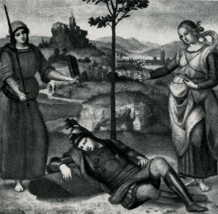 Сюжет картины «Сон рыцаря» был заимствован юным Рафаэлем из средневекового сказания, по-своему воссоздавшего античный миф о Геракле, который должен был определить свой жизненный путь, сделав выбор между Доблестью и Наслаждением. У Рафаэля вместо Геракла изображен заснувший под деревом молоденький рыцарь, а по сторонам от него – две прекрасные женские фигуры: одна манящая его цветами, другая предлагающая меч и книгу. Эта наивная аллегория пленяет зрителя робкой грацией и поэтической чистотой образов, хотя и выдает известную скованность и неуверенность молодого художника.