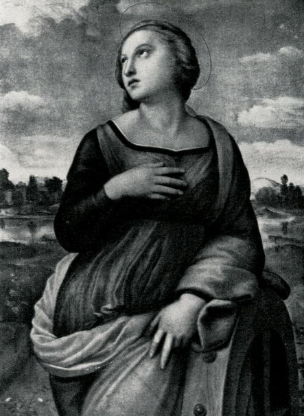 В «Св. Екатерине», исполненной всего десять лет спустя, в 1508 году, Рафаэль предстает перед нами уже как мастер большого монументального стиля. В картине царит мощная фигура св. Екатерины, рельефно выступая на фоне неба и мягкого пейзажа заднего плана. Богатая пластика ее тела, спокойного, но в то же время полного внутреннего движения, свободный плавный ритм и обобщенная линия контура, как бы единым взмахом очертившая всю фигуру, создают тот классически прекрасный естественно величавый образ, в котором воплотился идеал Высокого Возрождения.