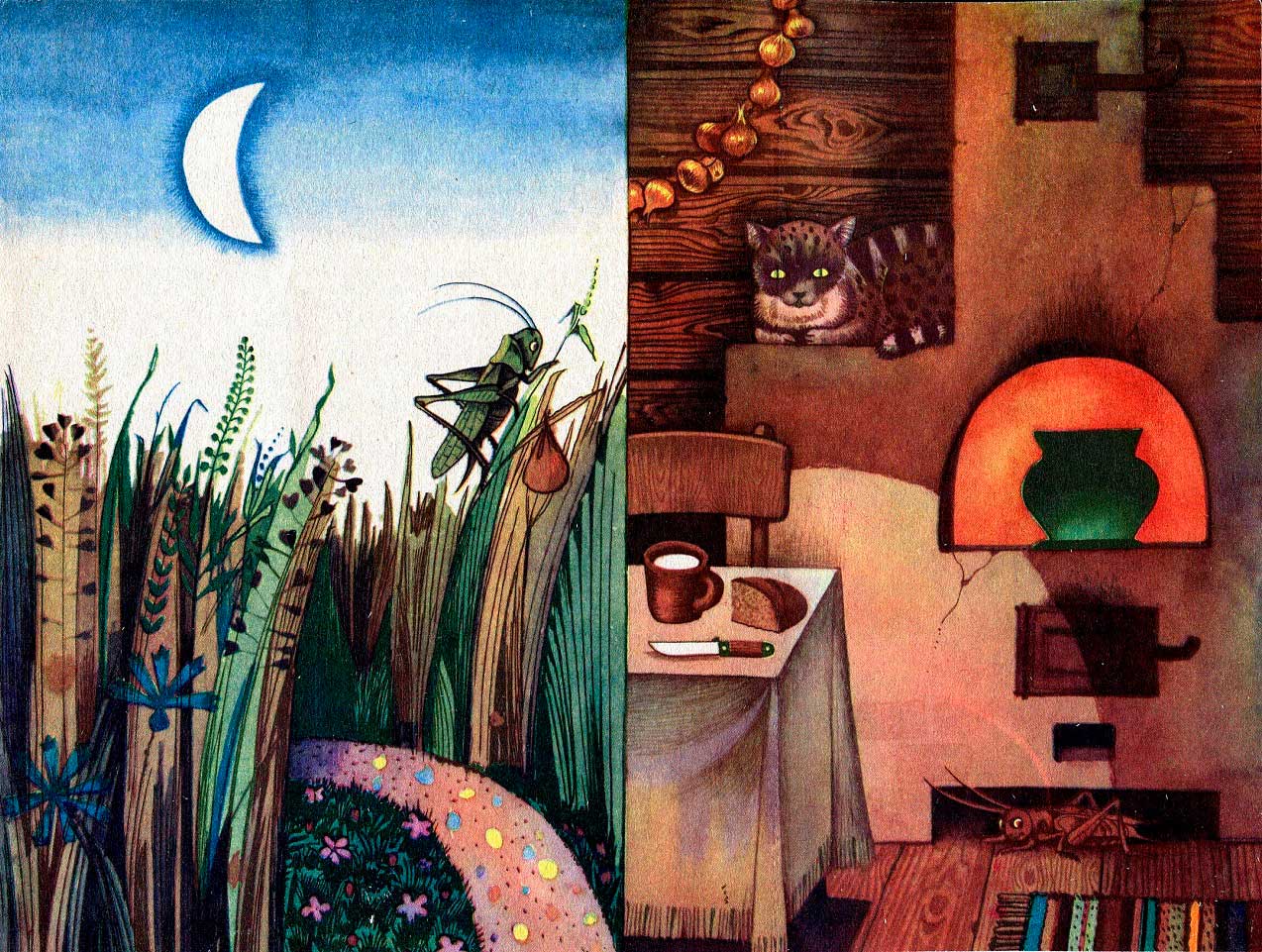 – Ой, Сверчок, не могу я больше под печкой сидеть. Жарко мне. Пойдём в поле. Там ветерок свежий. Луна светит. Трава вокруг густая-густая. Пойдём, а?!