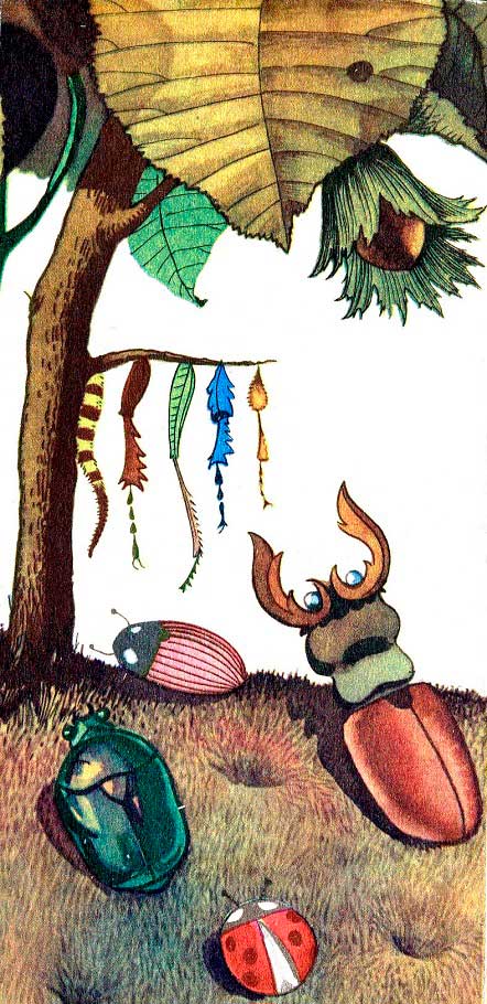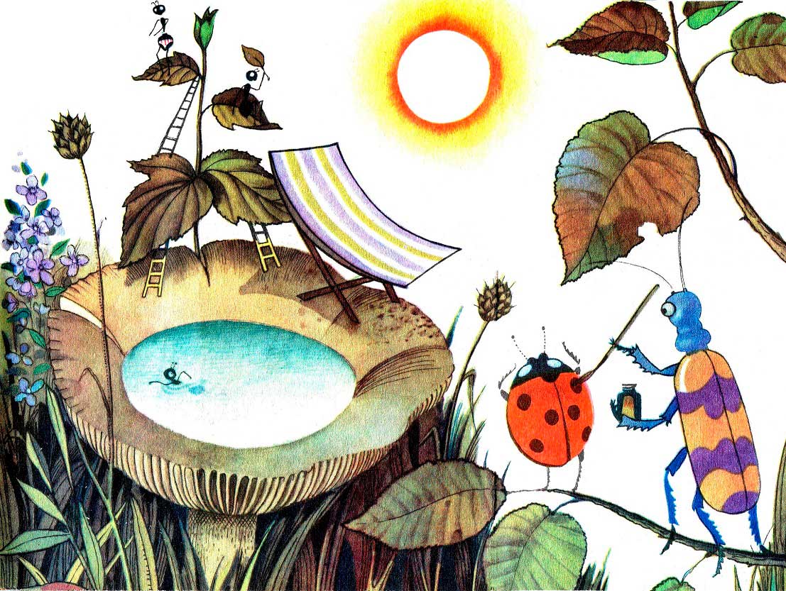 И тут Жук догадался. Он взял кисточку и раскрасил чёрными пятнышками всю спину Божьей Коровки. И от этого стала Божья Коровка ещё наряднее.