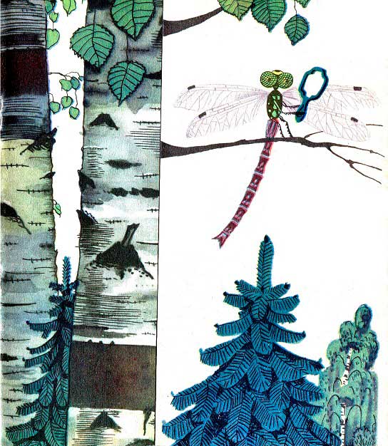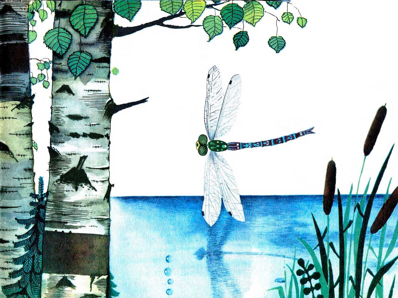 Так до сих пор и летает Стрекоза над водой. То поднимется, то опустится… И всё смотрит и смотрит на своё отражение. Никак не насмотрится.