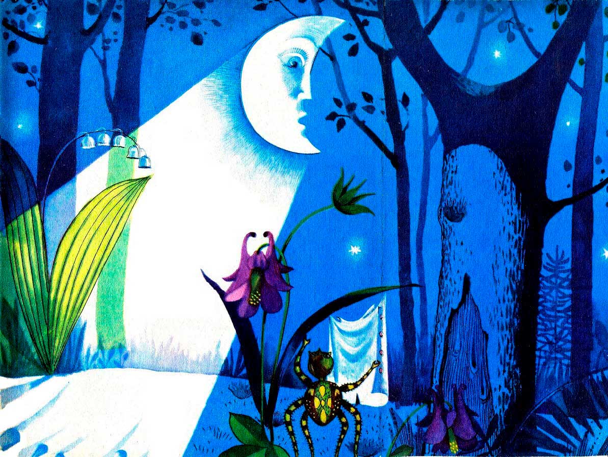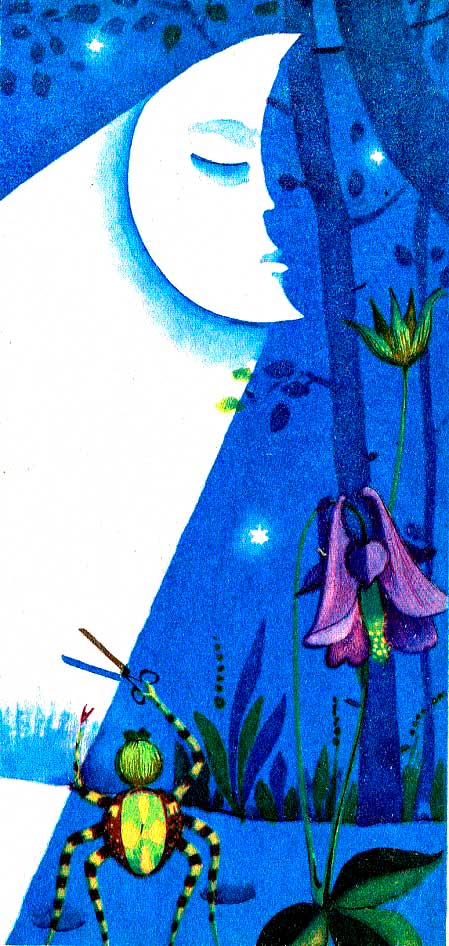 Потом Паучок распустил этот кусочек лунного платья и из драгоценной лунной пряжи соткал маленький светящийся плащ.