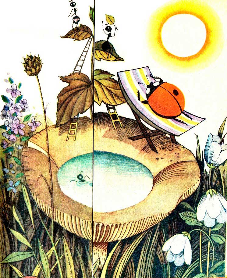 юбила Божья Коровка загорать на солнце. И однажды она так долго загорала, что задымилась её гладкая красная спинка, и появилось на ней круглое чёрное пятнышко.