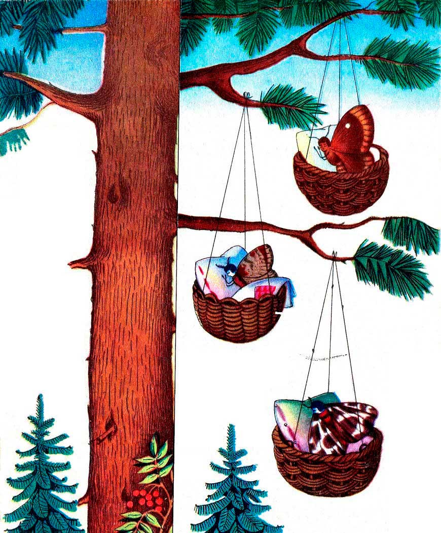Прошла ночь, наступило утро. А мотыльки всё спят, вот и день прошёл, вечер наступил. Солнце опустилось за ёлки. И тут мотыльки проснулись.