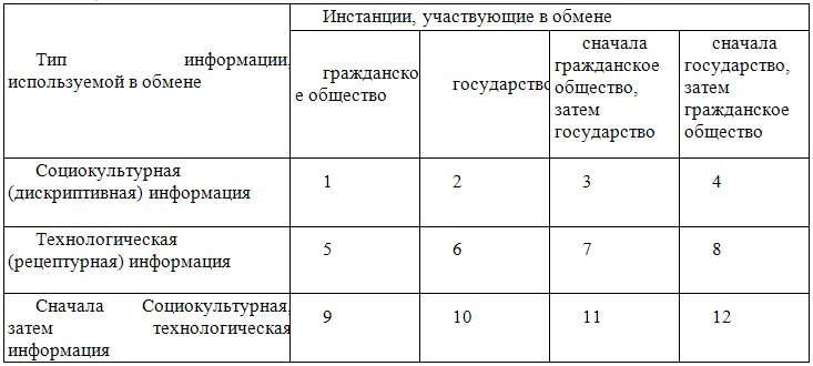 Иными словами, культуры больше обмениваются готовыми результатами деятельности, чем информацией, относящейся к технологическим основам этой деятельности и, тем более, к ее глубинным архетипическим предпосылкам. Можно сказать, что культуры в процессе обмена мистифицируют и дезориентируют друг друга. Типологию межкультурного обмена можно прояснить с помощью таблицы.