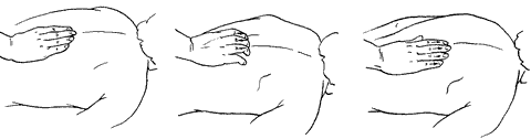 Накатывание (рис. 23) применяют при массаже живота, груди и боковых поверхностей спины. Прием проводят, захватив одной кистью массируемую область, а другой производят накатывающие движения, перемещая расположенные рядом ткани на фиксирующую кисть, и таким образом передвигаются по массируемому участку. Накатывающие движения можно выполнять на кулак или отдельные пальцы.