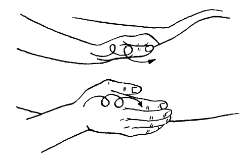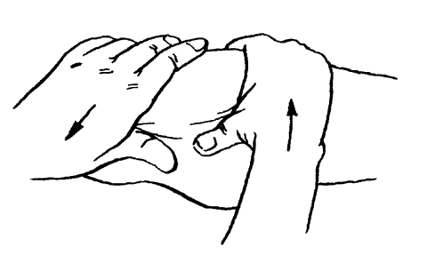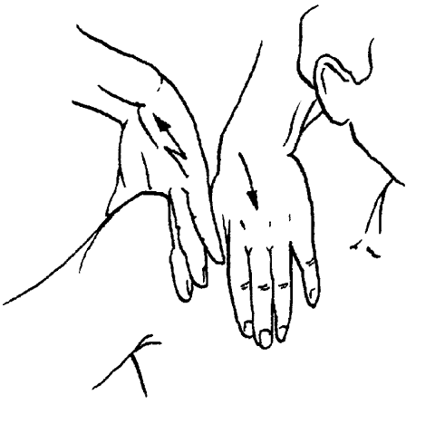 При растирании ладонями кисть плотно прижимается к массируемому участку, пальцы при этом плотно прижаты друг к другу, а большой отведен в сторону.