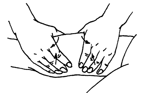 На прямых мышцах живота используют щипцеобразное поглаживание, глажение, разминание сверху вниз и снизу вверх.