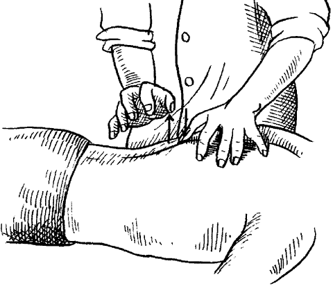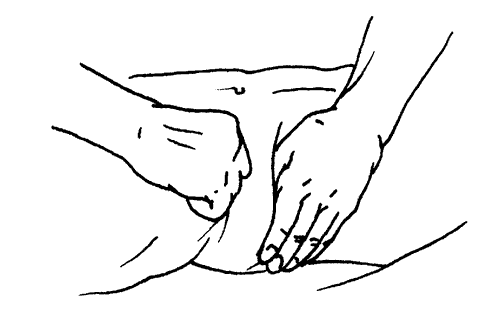 1-й способ. Массируемая мышца плотно обхватывается ладонью, причем с одной стороны мышцы располагается большой палец, а с другой – все остальные, затем ее приподнимают, сдавливая между пальцами, и совершают поступательные движения.