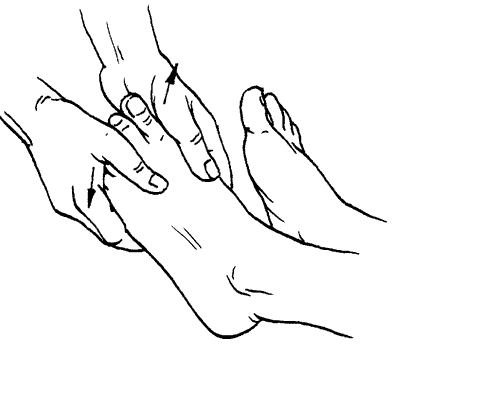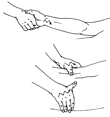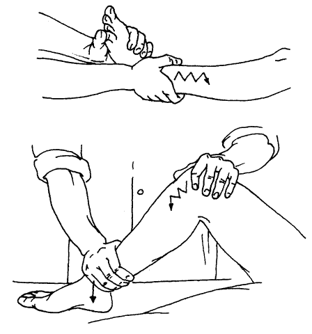Встряхивание применяют при массировании верхних и нижних конечностей. Прием проводят обеими руками или одной с фиксацией кисти или голеностопного сустава массируемого (рис. 31). Руки встряхивают в горизонтальной плоскости, взяв ее за кисть («рукопожатие»). Встряхивание ног выполняют в вертикальной плоскости с фиксацией голеностопного сустава при выпрямленном коленном суставе.