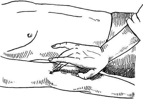 Область печени массируют по направлению снизу слева и направо вверх, концы пальцев при этом проникают под правый реберный край и производят спиралевидное растирание, вибрацию и сотрясение.
