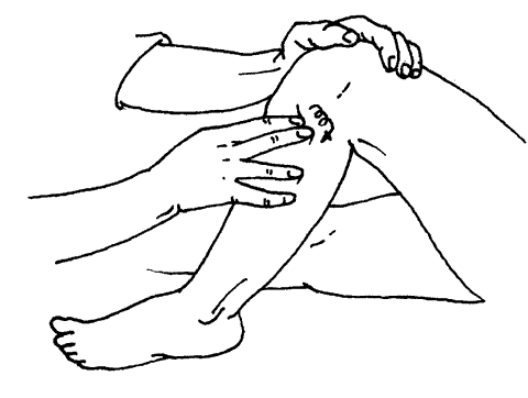 2-й способ. Мышцу разминают между пальцами, надавливая на нее с одной стороны большим пальцем, а с другой всеми остальными, продвигаясь по всей ее длине.