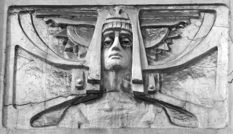 Фриз дома треста «Теплобетон» украшен барельефом с тремя аллегорическими фигурами, изображающими Технику, Искусство и Науку. Спиридоновка, 24/1