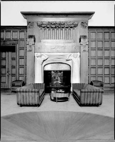 Расположение камина напротив окна глубоко символично. По задумке Федора Шехтеля гостиная особняка должна была представлять собой дорический храм. Пространство четко разделено на зоны – нефы. На месте алтаря, на востоке, – камин. На западе – то самое огромное окно, олицетворяющее вход в священное место. Однако каменные рельефы и фрески, которыми украшали стены и потолки дорических храмов, архитектор решил заменить изысканным деревянным убранством. Красным деревом декорировал не только стены, но и потолок. Изящные кованые люстры также выдержаны в изысканном стиле модерн.