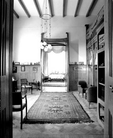 Кроме превосходной системы отопления в особняке была уникальная по тем временам система освещения. Например, в гостиной потолок «выложен» затейливыми цветами, сердцевины которых – электрические лампочки. Между потолком и стенами, обшитыми деревянными панелями, – довольно большие незаполненные «пространства». Шехтель собирался заполнить их живописными панно на тему «Времена года», которые он заказал замечательному художнику В.Э. Борисову-Мусатову. Фресок было задумано четыре, по одной на каждую стену холла, в излюбленной манере мастера: старинные усадьбы, зыбкие женские фигуры в сумерках парка. Но, как писал художник, «моя фреска потерпела фиаско… Сделал я четыре акварельных эскиза, и они всем очень понравились… Владелица же палаццо, где нужны эти фрески, благородно ретировалась, предложив за них гроши». Поговаривали, что к окончанию строительства у хозяйки не хватило денег ни на роскошное убранство интерьеров, ни на пышное декоративное панно.