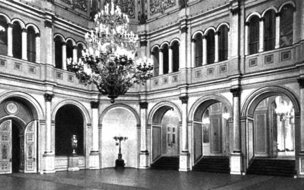 За Георгиевским залом следует – Александровский зал, в который ведут громадные резные позолоченные двери. Роскошно отделанный зал посвящен ордену Святого Александра Невского. Сферический купол зала покоился на парусных сводах, упиравшихся на четыре выступа. В золотых барельефах купола ярко выделялись знаки ордена с вензелем S. А. – Sanctus Alexander – Святой Александр. По углам купола и над массивными золочеными дверями располагались двуглавые орлы.