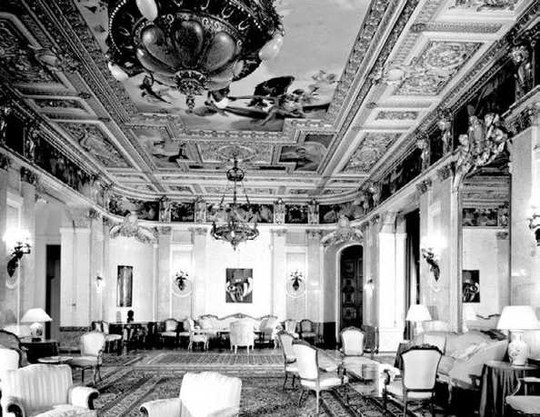 Парадный зал решен с использованием архитектуры барокко и классицизма. Роскошный потолок оформлен живописными сценками, по золоченому фризу вылеплены медальоны с симпатичными амурчиками. Барочная тема блестящей лепнины продолжена в настенных украшениях и зеркалах, обрамленных витиеватыми гирляндами из цветов и фруктов. Изысканные светильники при этом выполнены в стиле модерн: бра и люстры матового стекла, украшенные эмалью, цветными каменьями и бронзовыми драконами, представляющие собой едва ли не ювелирное украшение, прекрасно вписывается в роскошный интерьер дворца.